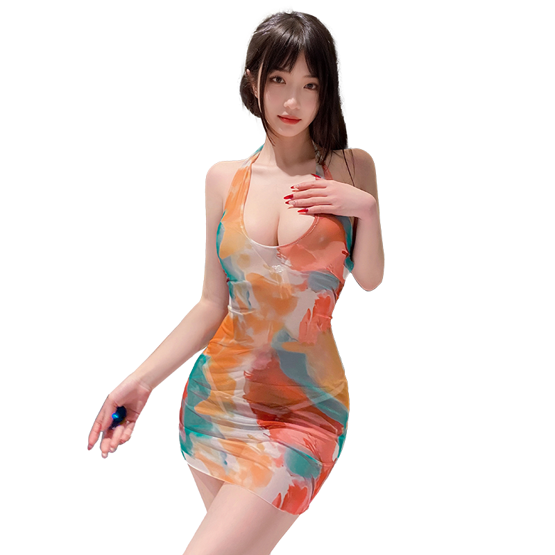 6308深U露沟晕染印花包臀裙
